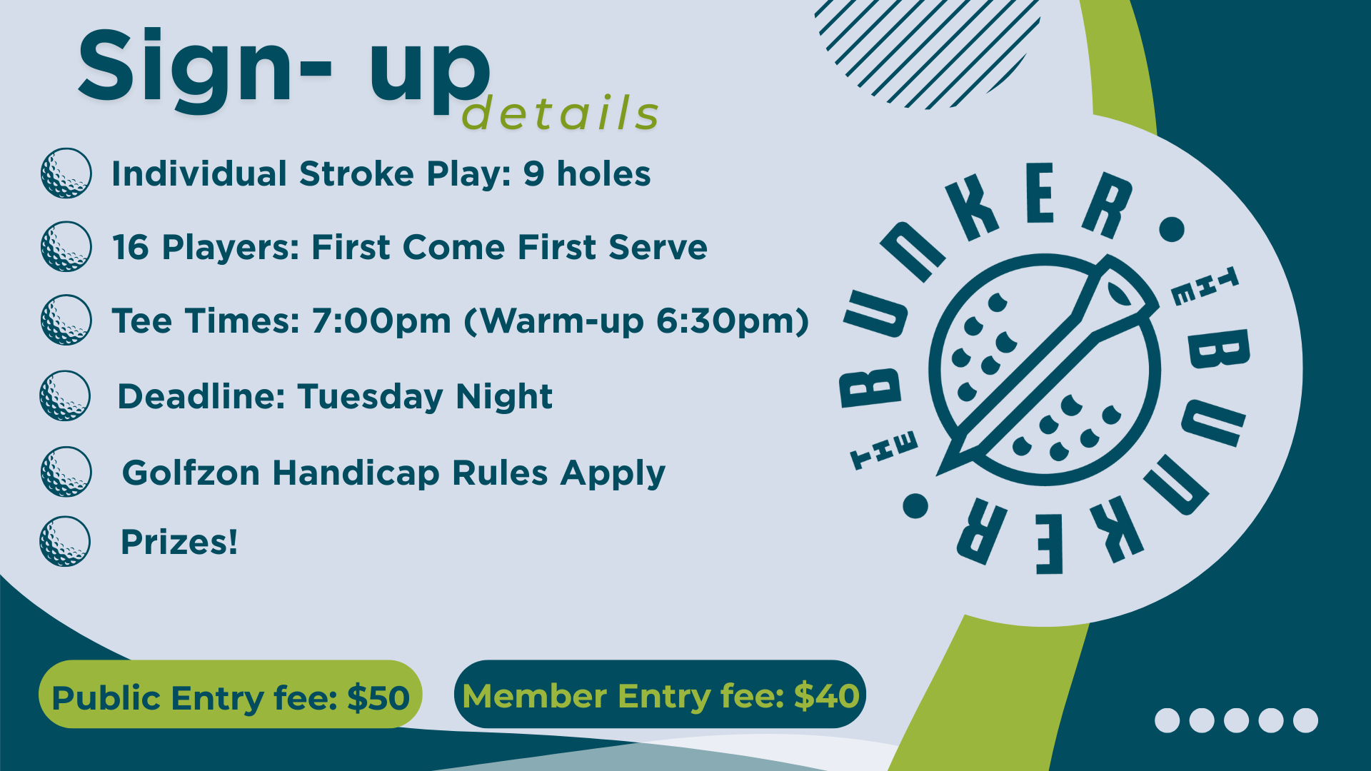 Wednesday Night Shootout Individual Stroke Play: 9 holes, new courses every week 16 players 1st come 1st serve, 6:30 warm up, Tee Off 7:00pm Entry fee (includes bay cost!)$50 for public players, $40 for our Members Golfzon HDCP rules apply, top prizes require at least 10 participants in the event Top Prize values 1st – […]